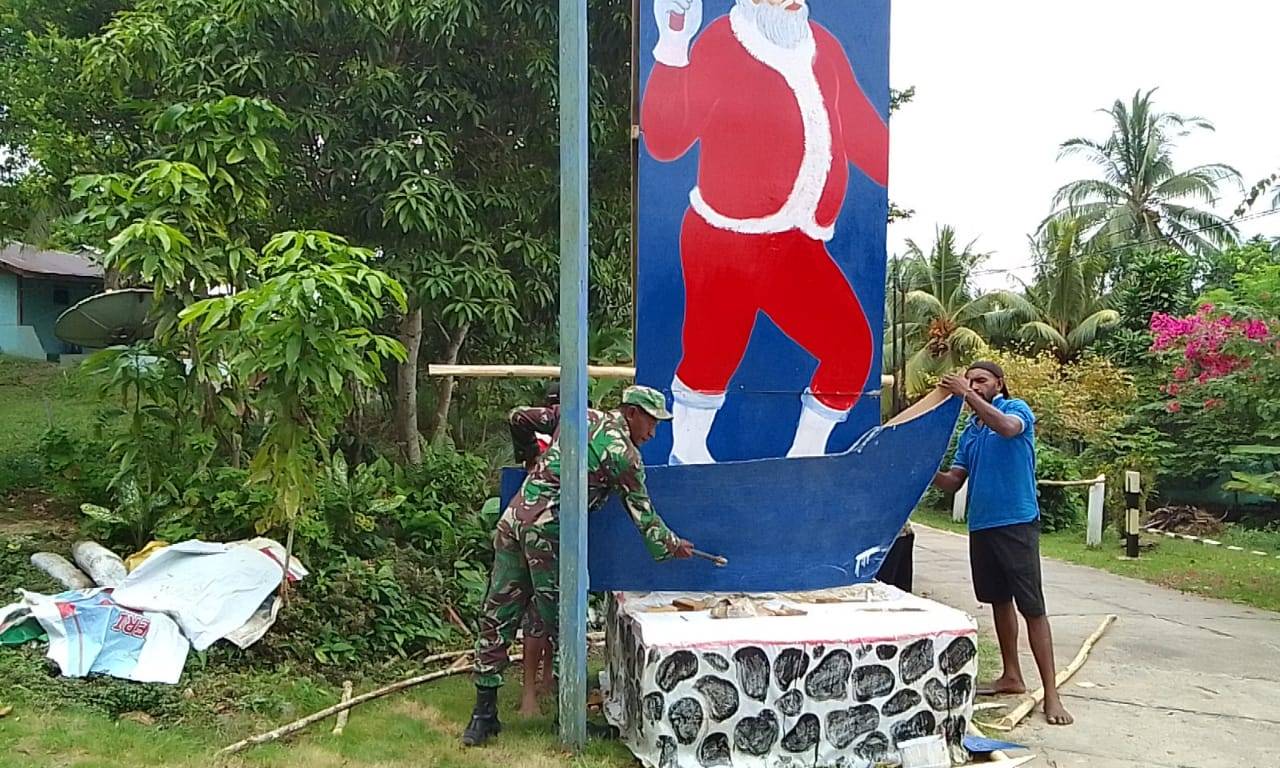 SENTANINEWS.ID – Numfor – Babinsa Koramil 1708-05/Numfor Kopda Lukius Rumbruren bergotong- royong bersama warga Kampung Namber dalam pembuatan gapura Natal, di Kampung Namber, Distrik Numfor Barat, Minggu (11/12/2022).