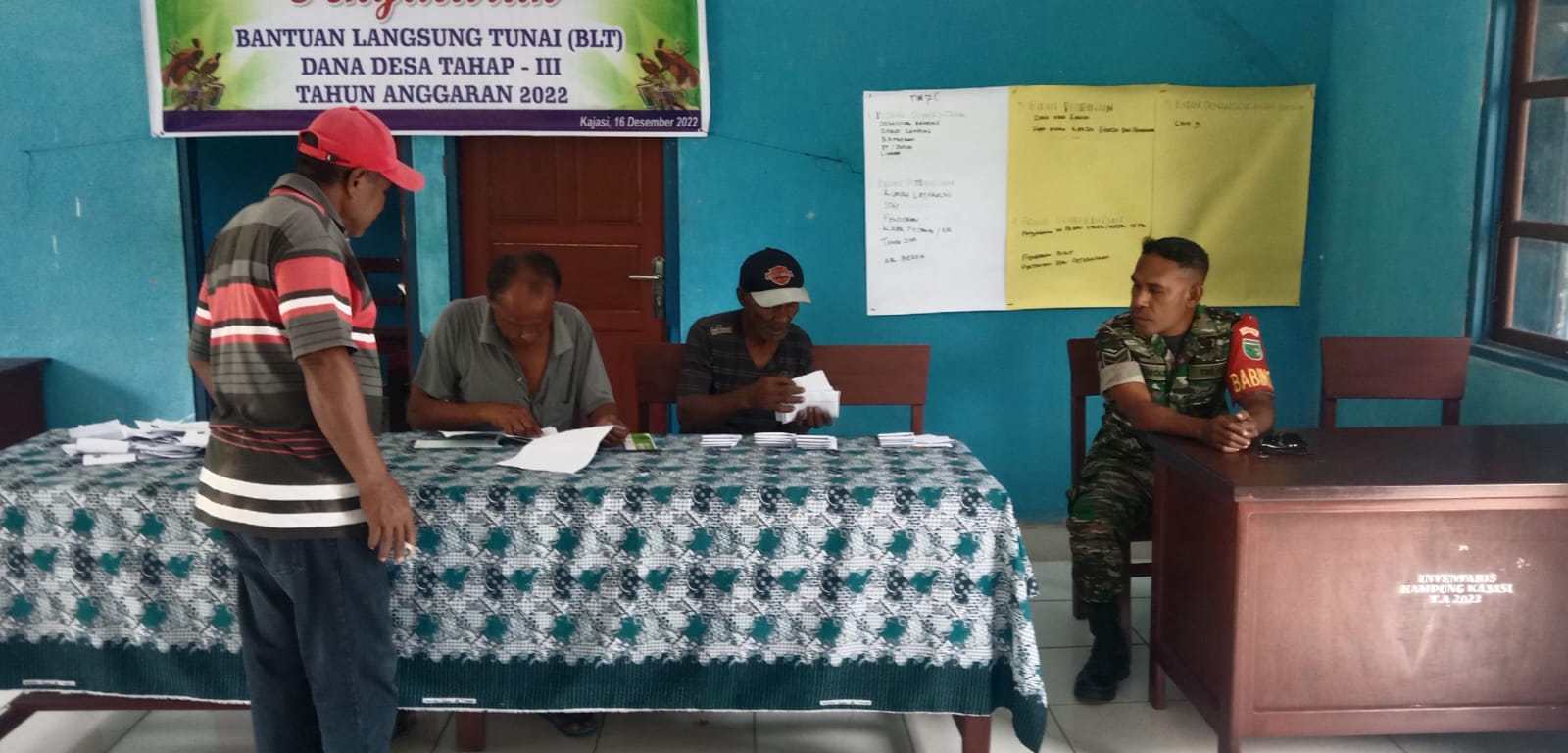 SENTANINEWS.ID – Biak Timur – Bertempat di Balai Kampung Kajasi, Babinsa Posramil 1708-01/Biak Timur Sertu Reynold A. J Rumpaisum melaksanakan monitoring dan pengamanan kegiatan penyaluran Bantuan Langsung Tunai (BLT) Dana Desa (DD) Tahap III Tahun 2022 di Kampung Kajasi, Distrik Biak Timur, Kabupaten Biak Numfor, Papua, Sabtu 17 Desember 2022.