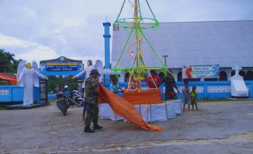 SENTANINEWS.ID – Numfor – Babinsa Koramil 1708-05 / Numfor Serda Silveter Noo mengunjungi kampung binaannya dan membantu menghiasi Geraja GKI Rehobot dengan membuat pohon Natal dalam rangka menyambut Natal di Kampung Syoribo, Distrik Poiru, Kabupaten Biak Numfor, Papua, Minggu 18 Desember 2022.