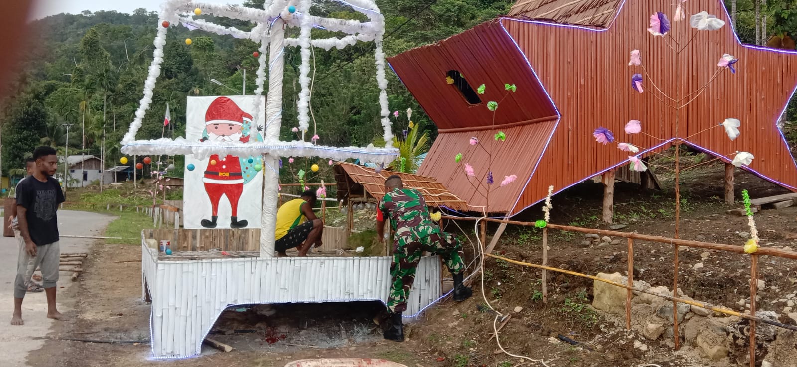“Pembuatan Gapura dan pohon Natal ini merupakan suatu kegiatan yng dilaksanakan tiap tahun dimana momen ini dapat mempererat hubungan dengan warga agar lebih dekat,” kata Babinsa Serda Sudirman Wakimin.