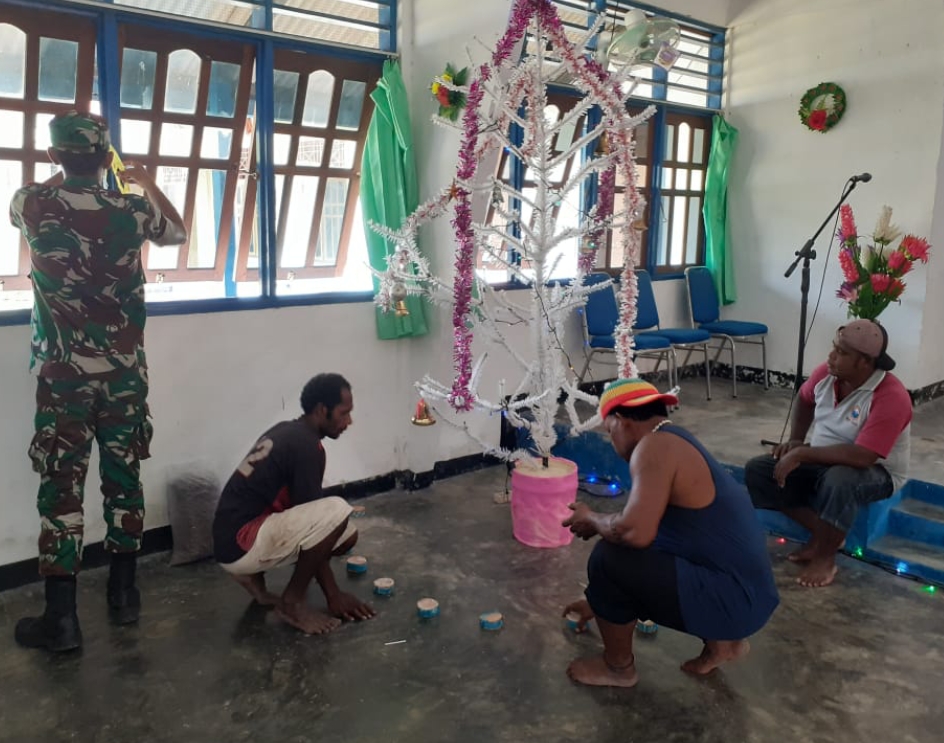 SENTANINEWS.ID – Numfor – Babinsa Koramil 1708-05/Numfor, Pratu Ana Ardiansyah bersama warga Jemaat GKI Imanuel Kornasoren dekorasi gereja dalam rangka menyambut Hari Raya Natal 2022 di Kampung Kornasoren, Distrik Numfor Timur, Kabupaten Biak Numfor, Papua, Kamis 22 Desember 2022.