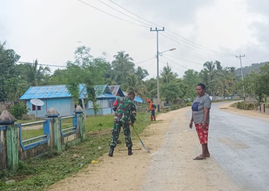 SENTANINEWS.ID – Warsa – Babinsa Posramil 1708-02/BU-Warsa Sertu Abdullah bersama warga masyarakat melaksanakan kegiatan kerja bakti membersihkan pinggiran jalan di sepanjang kampung binaannya, di Kampung Sawai, Distrik Warsa, Kabupaten Biak Numfor, Papua, Minggu pagi 25 Desember 2022.