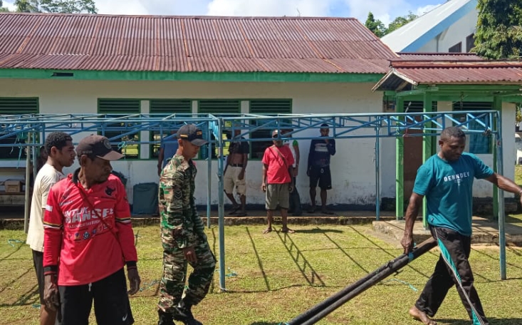 SENTANINEWS.ID – Warsa – Babinsa Posramil 1708-02/BU-Warsa, Sertu Abdullah melaksanakan Kerja Bakti bersama warga masyarakat binaannya dengan membantu memasang kerangka tenda besi yang akan dipergunakan dalam ibadah Kaum Pemuda Jemaat GKI Silo Asur, Kampung Asur, Distrik Yawosi, Kabupaten Biak Numfor, Papua, Senin 02 Januari 2023.