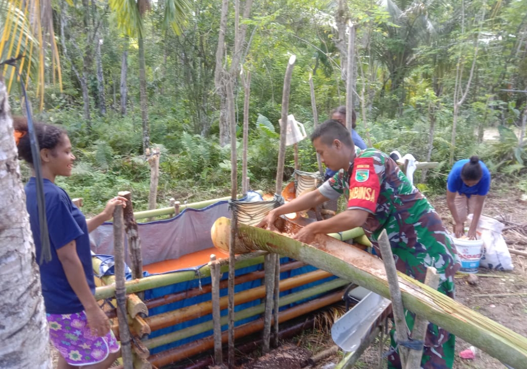 Pada momentum itu, Kopda Teguh membantu proses pengolahan sagu milik Mama Martha Krar secara tradisional mulai dari proses meremas serta proses pemadatan sari sagu.