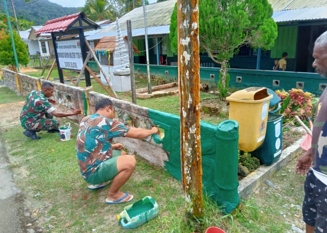 SENTANINEWS.ID – Supiori – Dalam rangka pembinaan Satuan agar terlihat rapi dan bersih, Danramil 1708-04/Supiori Selatan Letda Inf Eduard Lewerissa beserta anggota melaksanakan pembenahan pangkalan dengan pengecatan pagar dan pembersihan halaman di Makoramil 1708-04/Supiori Selatan, Distrik Supiori Selatan, Kabupaten Supiori, Papua, Minggu 08 Januari 2023.