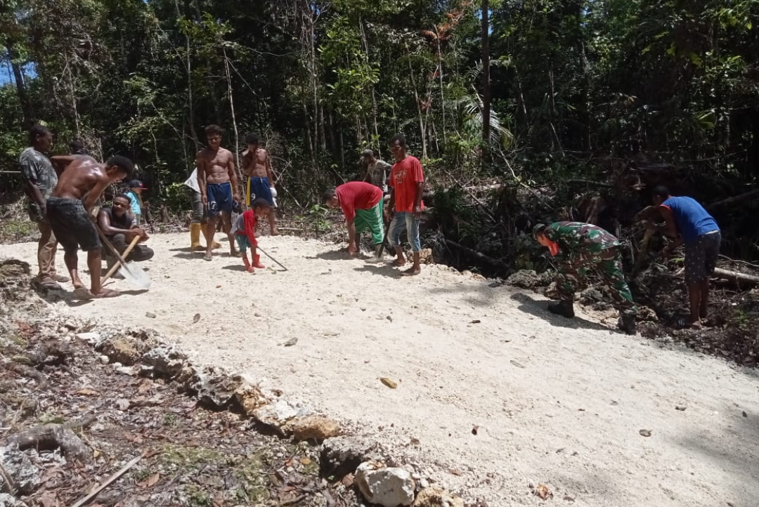 Pada momentum itu, Babinsa Serka Sampurno membantu warga binaan yang sedang membangun jalan setapak agar lebih dekat untuk menuju kebun di kampung Syoribo.