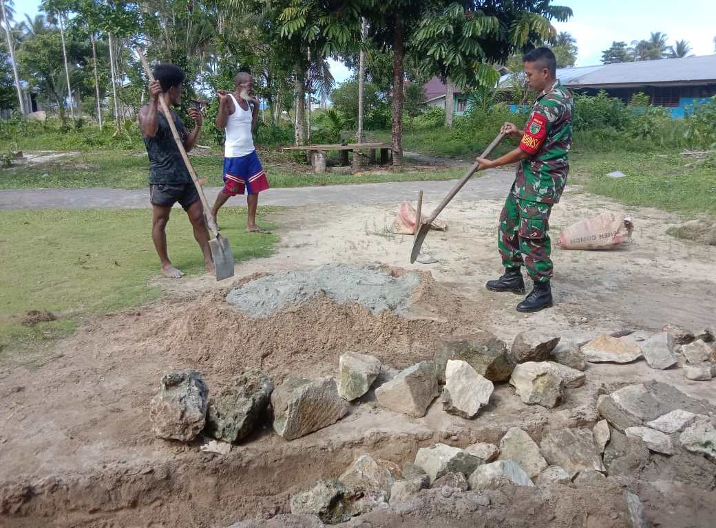 SENTANINEWS.ID – Warsa – Guna terciptanya sinergitas TNI bersama rakyat, Babinsa Posramil 1708-02/BU-Warsa Kopda Teguh membantu pembuatan pondasi pembangunan rumah milik Bapak Maurits Mamoribo, di Kampung Amoi, Distrik Warsa, Kabupaten Biak Numfor, Papua, Rabu 11 Januari 2023.