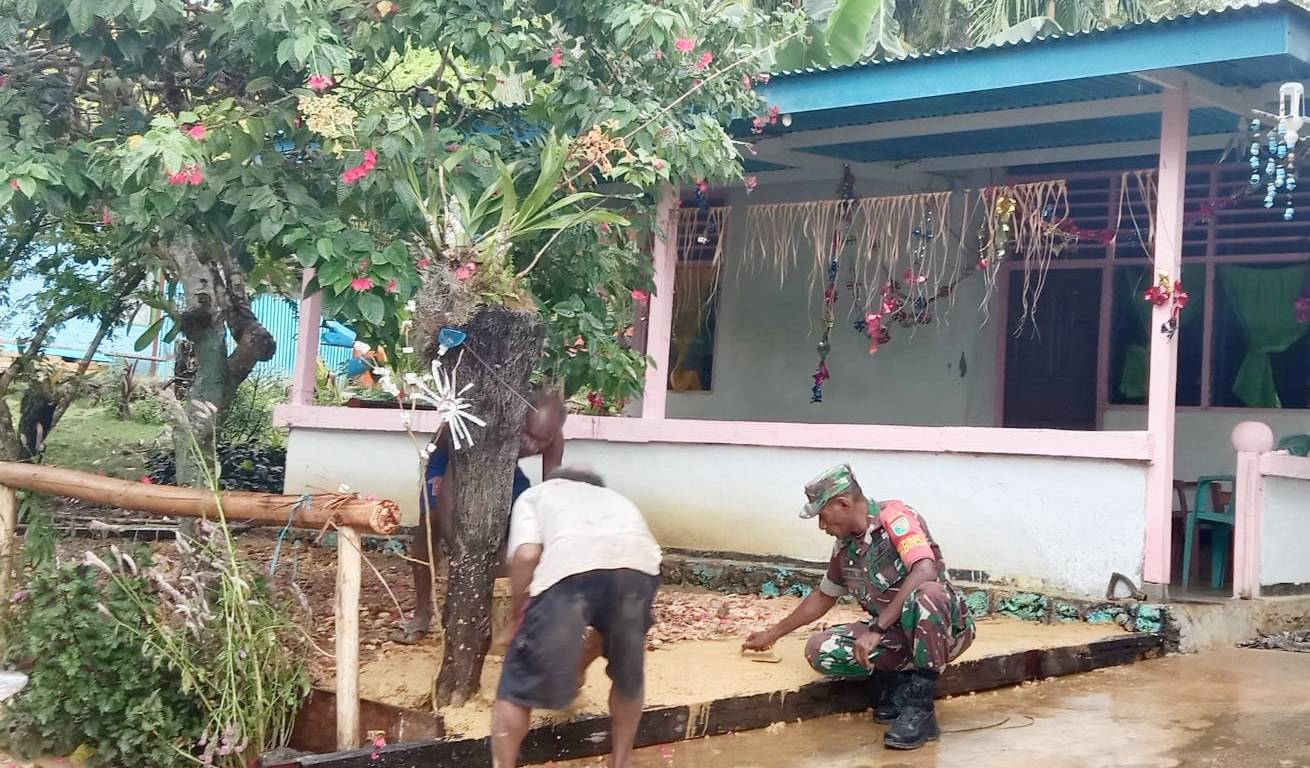 SENTANINEWS.ID – Supiori – Sebagai salah satu bentuk bakti kepada masyarakat, babinsa Koramil 1708-04/Supiori Selatan Serka Falentinus Warfandu bantu pengecoran halaman rumah Bapak Yustinus Kmur di Kampung Ramardori, Distrik Supiori Selatan, Kabupaten Supiori, Papua, Kamis 12 Januari 2023.