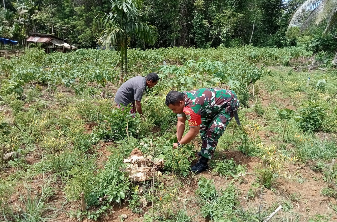 SENTANINEWS.ID – Biak Timur – Babinsa Posramil 1708-01/Biak Timur Sertu Wahyu Hendro Patrias Setiawan melaksanakan pendampingan kepada salah satu petani di wilayah binaan dengan membantu pembersihan rumput dan gulma di lahan cabai milik Bapak Matias S di Kampung Rimba Jaya, Distrik Biak Timur, Kabupaten Biak Numfor, Papua, Sabtu 14 Januari 2023.