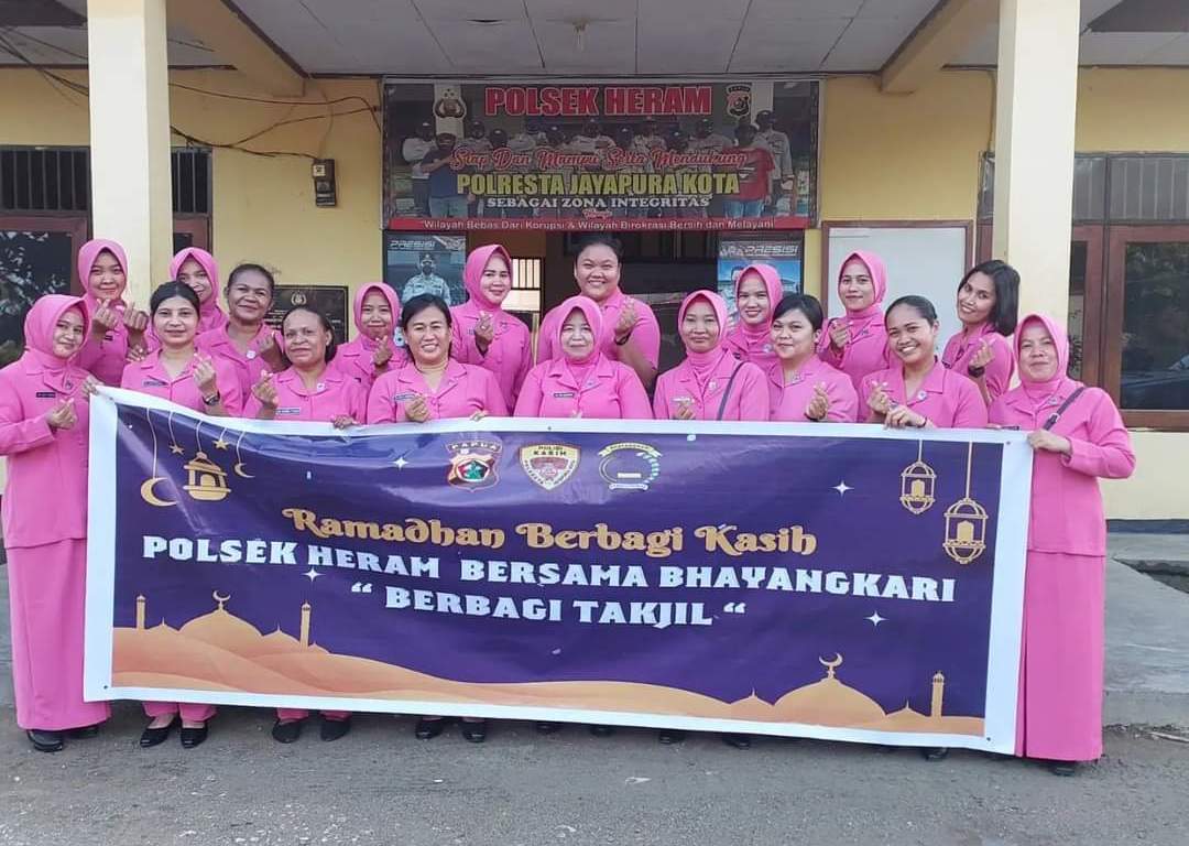 SENTANINEWS.ID – Jayapura Kota – Kapolsek Heram AKP Frangky Rumbiak bersama personelnya didampingi Ketua Bhayangkari Ranting Heram dan Pengurus Bhayangkari berbagi kasih di bulan Ramadhan 1444 Hijriah dengan membagikan takjil bertempat di Traffic Light Waena Distrik Heram, Kota Jayapura, Papua, Sabtu sore, 01 April 2023.