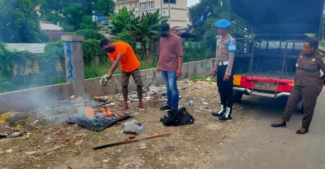 SENTANINEWS.ID – Jayapura Kota – Penyidik Satuan Reserse Narkoba Polresta Jayapura Kota bersama dua tersangkanya lakukan pemusnahan barang bukti (BB) berupa ganja dengan disaksikan Jaksanya masing-masing dengan cara membakar yang dilaksanakan di Ampera belakang Toko Saudara Dua, Distrik Jayapura Selatan, Kota Jayapura, Papua, Selasa siang, 11 April 2023.