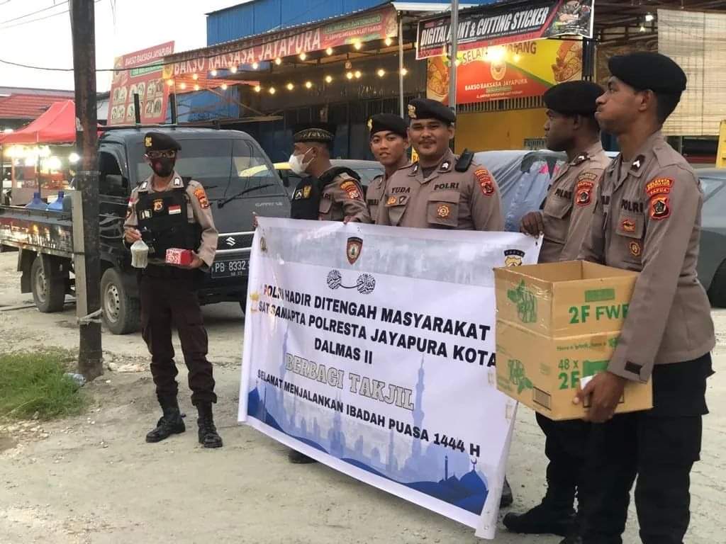 SENTANINEWS.ID – Jayapura Kota – Bertempat di Traffic Light Hamadi Distrik Jayapura Selatan, Dalmas Regu II Satuan Samapta Polresta Jayapura Kota laksanakan giat berbagi kasih dengan membagikan paket takjil kepada masyarakat dan pengendara yang melintas pada Selasa sore, 18 April 2023.