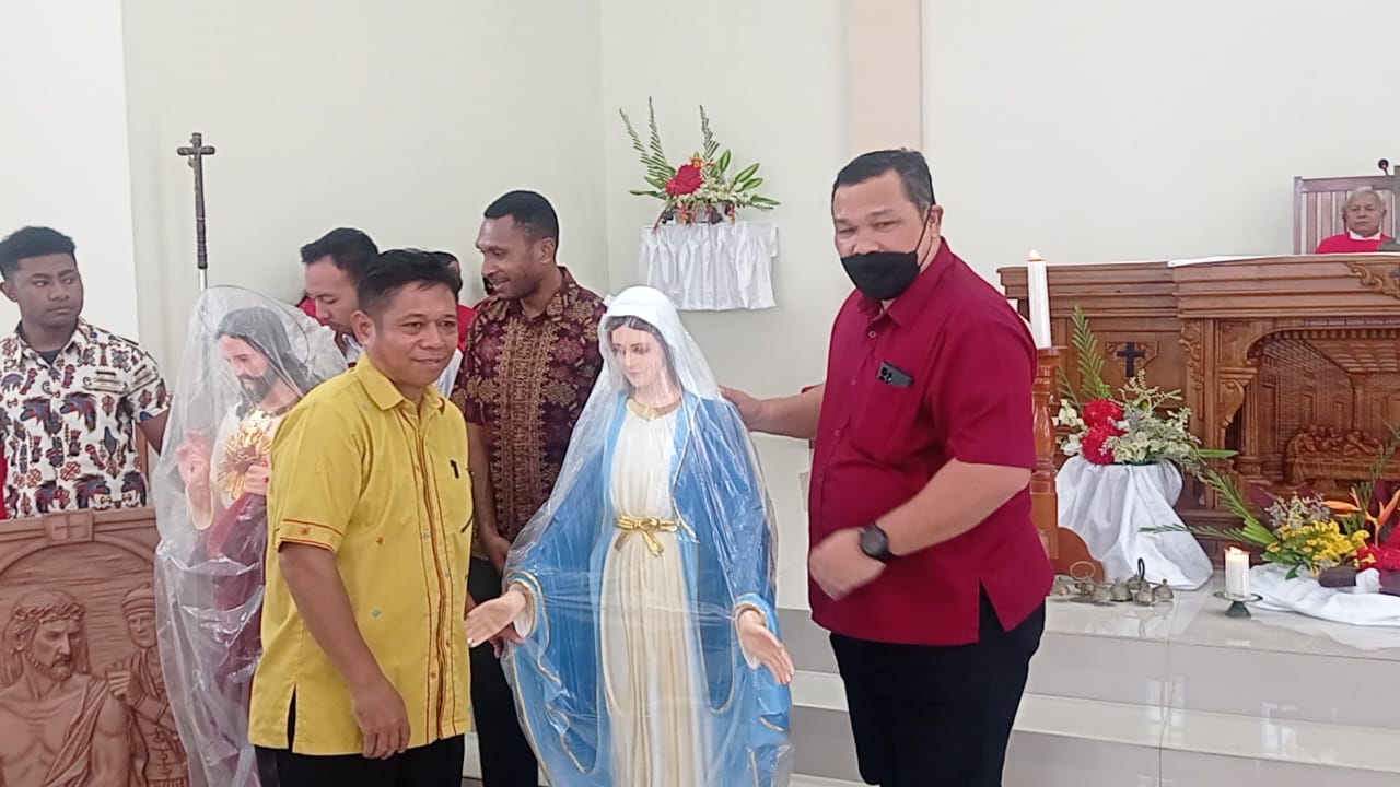 Pemberian bantuan itu diwakili oleh Direktur Intelkam Polda Papua Kombes Pol Dr Tagor Hutapea SIK, M.Si didampingi Kasubdit II Ekonomi Kompol Laurens T Tukan dengan menyerahkan salib dan patung Yesus, patung Bunda Maria serta 14 relief jalan salib kepada perwakilan umat dan panitia pembangunan, Linus Sarawa dihadapan umat Katolik.