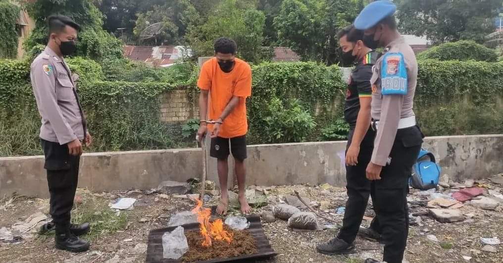 SENTANINEWS.ID – Jayapura Kota – Penyidik Satuan Reserse Narkoba Polresta Jayapura Kota bersama tersangkanya seorang pria berinisial VN (25) lakukan pemusnahan barang bukti berupa narkotika jenis Ganja bertempat di Ampera belakang Toko Saudara Dua, Kota Jayapura, Papua, Senin siang, 29 Mei 2023.