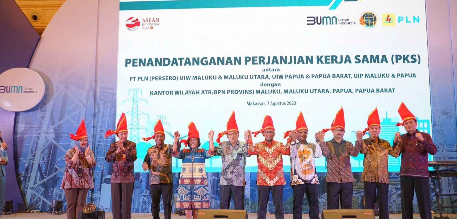Penandatanganan Perjanjian Kerja Sama dilakukan oleh General Manager PLN UIP MPA, General Manager PLN UIW MMU, General Manager UIW P2B, Kepala Kanwil ATR/BPN Maluku, Kepala Kanwil ATR/BPN Maluku Utara, Kepala Kanwil ATR/BPN Papua dan Kepala Kanwil ATR/BPN Papua Barat pada Senin (7/8) di Grand Diamond Ballroom Myko Hotel & Convention Center, Makassar.