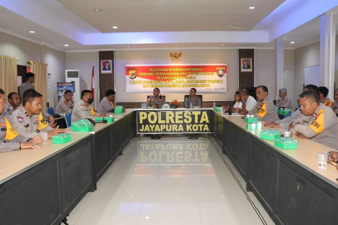 Giat pelatihan Bhabinkamtibmas yang diselenggarakan Satuan Binmas Polresta Jayapura Kota dalam rangka memberikan Pemahaman dan Pengetahuan Pelanggaran Pemilu yakni Black Campaign, Hoax, Sara dan Money Politic.