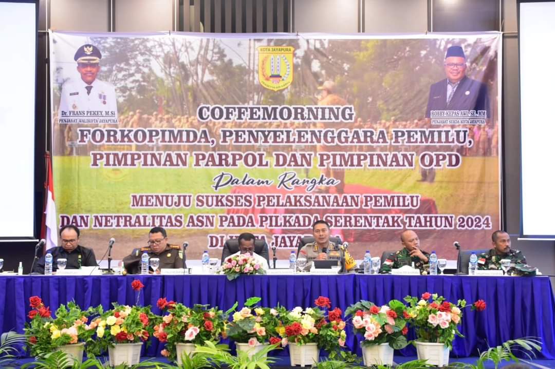 SENTANINEWS.ID – Jayapura Kota – Usai hadiri Lat Pra Ops Mantab Brata Cartenz 2023 bersama Personelnya, Kapolresta Jayapura Kota Kombes Pol Dr. Victor D. Mackbon, S.H., S.IK., M.H., M.Si kembali menghadiri Coffee Morning bersama Forkopimda Kota Jayapura membahas tentang jalannya pesta demokrasi yang akan berlangsung pada tahun 2024, di Ballroom Lantai 11 Hotel Aston Jayapura, Papua, Rabu pagi, 25 Oktober 2023.