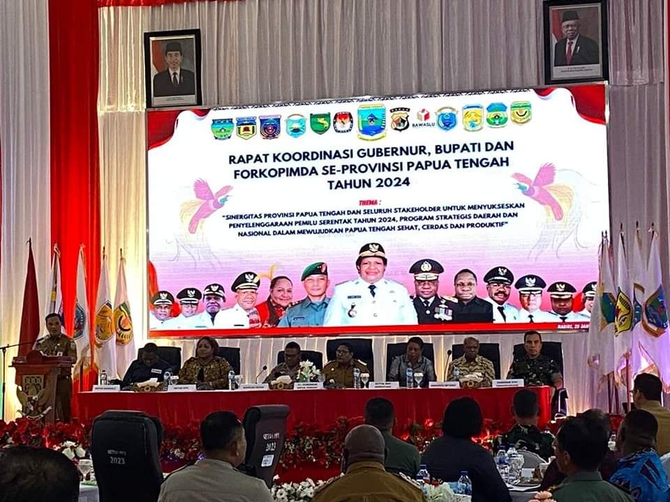 “Rakorda ini untuk memastikan kesiapan dari pada segenap para penyelenggara yang terlibat dalam Pemilu Serentak Tahun 2024 di wilayah Provinsi Papua Tengah,” jelas PJ Gubernur Provinsi Papua Tengah.