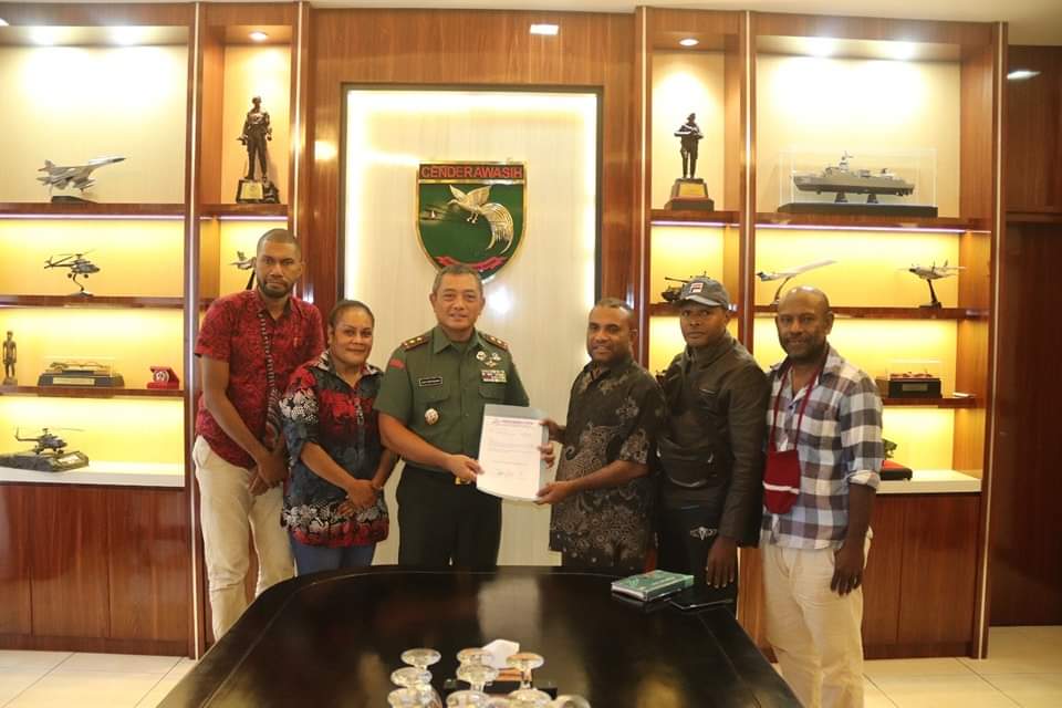 Pangdam didampingi Asisten Teritorial (Aster) Kasdam XVII/Cen Kolonel Inf Rudianto, menerima kedatangan Ketua Forum Gerakan Membela (Gembala) Hak Orang Asli Papua Othis Suwae bersama Edward Apaseray, Astrid Taime, Renould dan Ansalmus Toto.