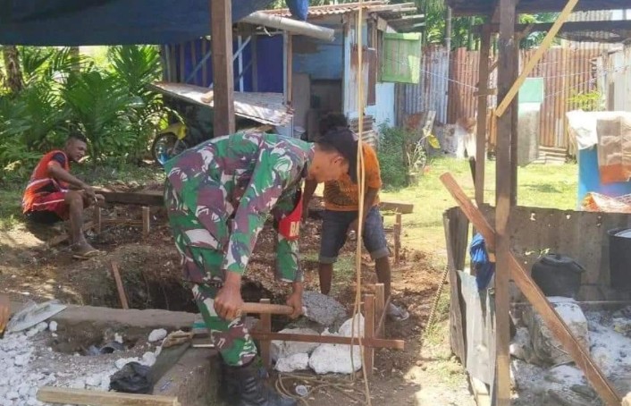 SENTANINEWS – Jayapura Kota – Babinsa Koramil 1708-01/Biak Kota Sertu Sriyono bersama warga melaksanakan kegiatan Karya Bakti (Karbak) membantu pembuatan pondasi septic tank milik Bapak Kafiar, Kampung Yendidori, Distrik Yendidori, Kabupaten Biak, Papua, Sabtu 16 November 2024.