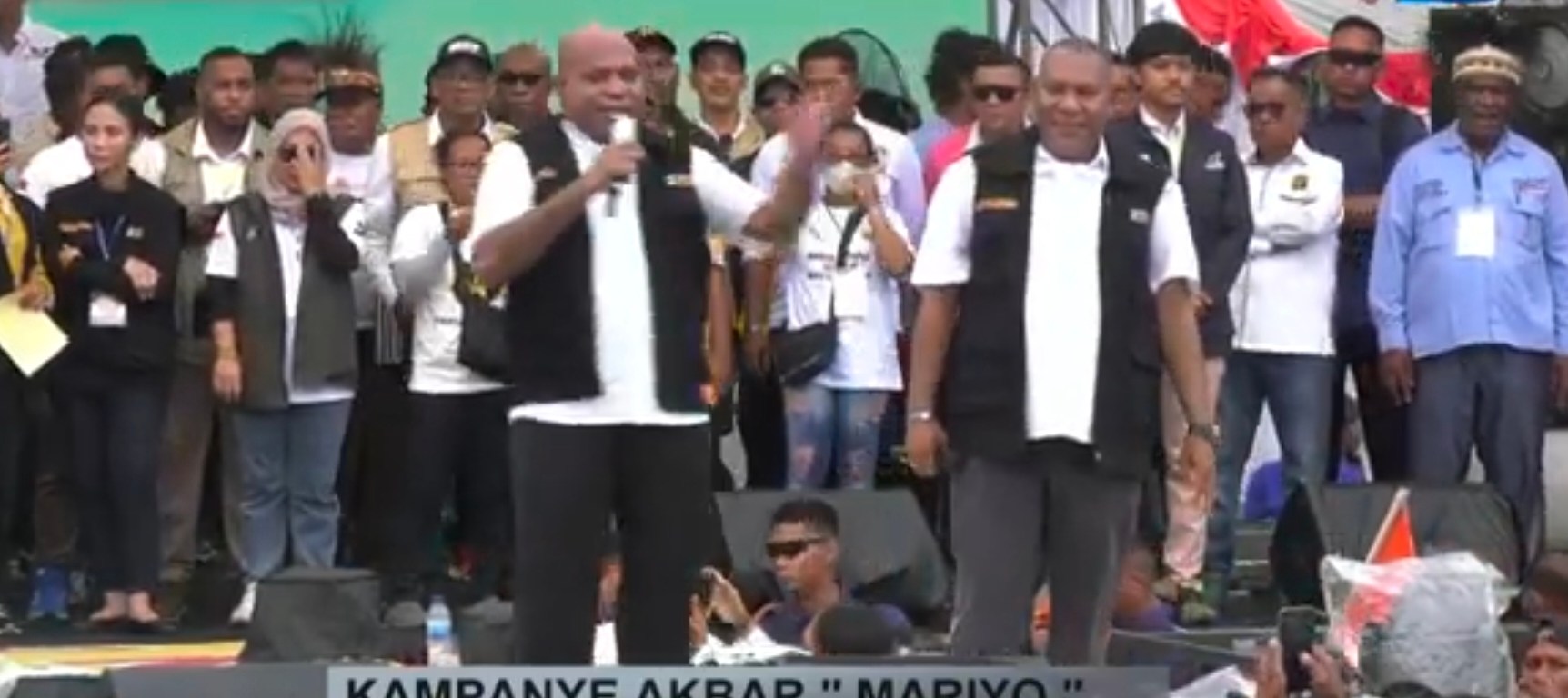 “Mari kita semua jaga kedamaian,” ajak Mathius saat orasi politik dalam kampanye akbar di Lapangan Karang PTC Kelapa Dua Entrop, Distrik Jayapura Selatan, Kota Jayapura, Papua, Sabtu sore 23 November 2024.