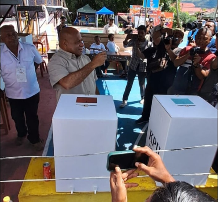 SENTANINEWS.ID – Jayapura Kota – Calon Gubernur Papua Nomor Urut 2 Mathius Fakhiri menggunakan hak pilihnya pilihnya di TPS 9 RT04 RW06 Kelurahan VIM, Distrik Abepura, Kota Jayapura, Provinsi Papua, Rabu sekitar pukul 12.50 WIT, 27 November 2024.