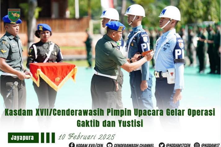 Panglima Kodam (Pangdam) XVII/Cenderawasih Mayjen TNI Rudi Puruwito, S.E., M.M diwakili Kepala Staf Kodam (Kasdam) XVII/Cenderawasih Brigjen TNI Thevi A Zebua, S.E., M.M memimpin Upacara Gelar Operasi Gaktib dan Operasi Yustisi TA 2025 bertempat di lapangan Makodam XVII/Cenderawasih, Kota Jayapura, Papua, pada Senin 10 Februari 2025.