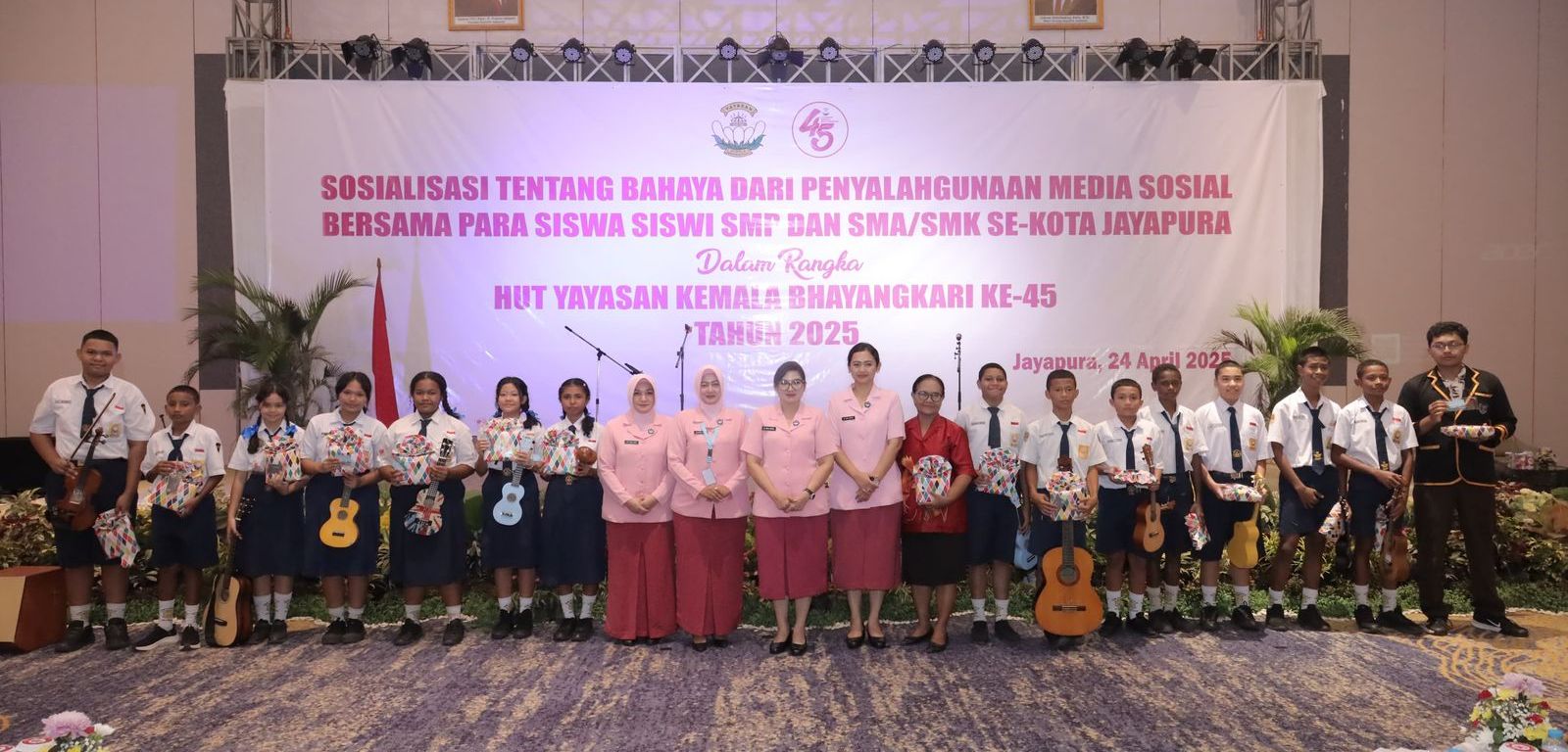 SENTANINEWS.ID – Jayapura Kota – Kemala Bhayangkari Daerah Papua menggelar sosialisasi tentang bahaya penyalahgunaan media sosial (berita bohong/hoax, judul, pinjol, tipu online dan arisan online) yang melibatkan 494 siswa siswi SMP/SMU/K se-Kota Jayapura.