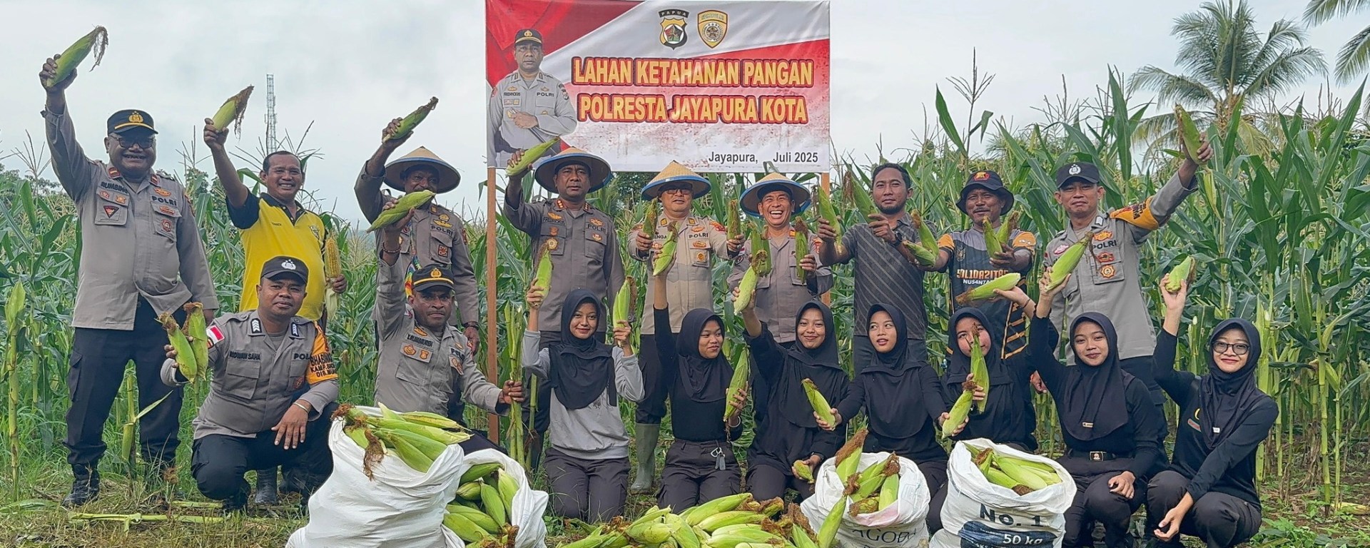 ”Hari ini di lokasi kebun ketahanan pangan yang dibina oleh Polsek Muara Tami, kami lakukan panen jagung di tanah seluas setengah hektar seperti yang terlihat,” ungkap Kapolresta.