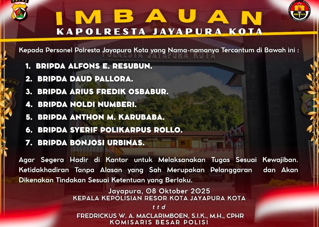 ”Ya, melalui media ini, saya selalu Kapolresta Jayapura Kota menghimbau tujuh personel saya yang tidak pernah masuk kantor untuk segera masuk dan laksanakan tugas sesuai dengan tanggung jawab yang diberikan,” ungkap Kapolresta KBP Fredickus Maclarimboen saat diwawancarai di Jayapura, Rabu siang, 8 Oktober 2025.