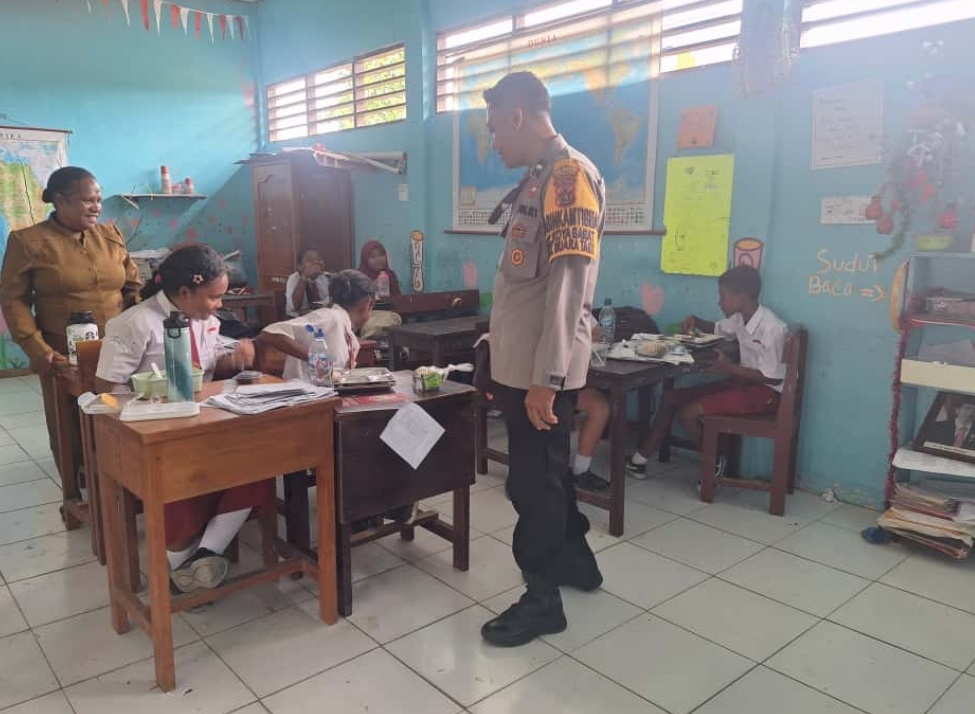 Bhabinkamtibmas Kelurahan Koya Barat, Aipda Usman Ardian, melaksanakan kegiatan pengawasan sekaligus pendistribusian MBG di SDN Inpres 1 Koya Barat, Kelurahan Koya Barat, Distrik Muara Tami, Kota Jayapura, Selasa pagi, 18 November 2025.
