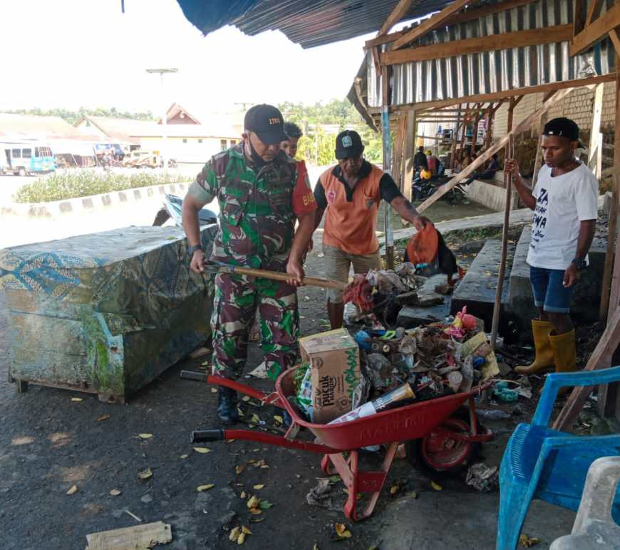 Ciptakan Lingkungan Yang Bersih dan Asri, Babinsa Bantu Mama-mama Bersihkan Sampah di Pinggir Jalan