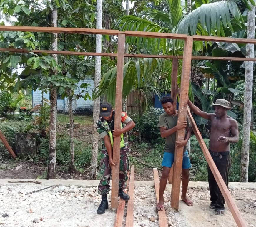 Babinsa Bantu Warga Kampung Dedifu Dalam Pemasangan Tiang Rumah