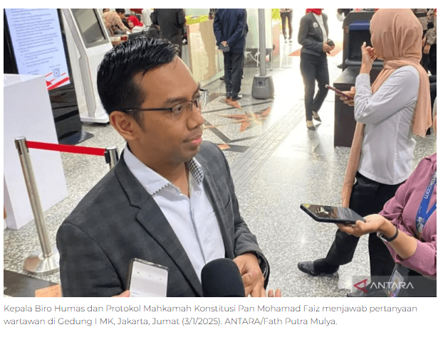 SENTANINEWS.ID – JAKARTA – Mahkamah Konstitusi secara resmi telah meregistrasi sebanyak 309 perkara perselisihan hasil pemilihan gubernur, bupati, dan wali kota atau sengketa Pemilihan Kepala Daerah (Pilkada) 2024 per Jumat pukul 14.49 WIB. “Hari ini, tanggal 3 Januari 2025 sudah dilakukan registrasi perkara untuk permohonan yang masuk. Jumlahnya itu 309 perkara perselisihan hasil pemilihan kepala daerah,” kata Kepala Biro Humas dan Protokol MK Pan Mohamad … Lanjutkan membaca MK telah registrasi 309 perkara sengketa Pilkada 2024