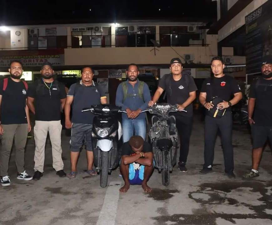 Jayapura – Tim Resmob Numbay kembali berhasil mengungkap kasus Curanmor, kali ini tim mengamankan dua pelaku curanmor dan satu penadah bersama barang buktinya. Hal tersebut diungkapkan Kasat Reskrim Polresta Jayapura Kota AKP Handry M. Bawiling, S.Sos., M.M saat ditemui di ruang kerjanya, Kamis siang, 21 Juli 2022. AKP Handry mengatakan, dua pelaku yang diamankan yakni LR (20) dan RG (18) bersama barang bukti SPM milik … Lanjutkan membaca Tim Resmob Numbay Ciduk Dua Pelaku Curanmor dan Satu Penadah