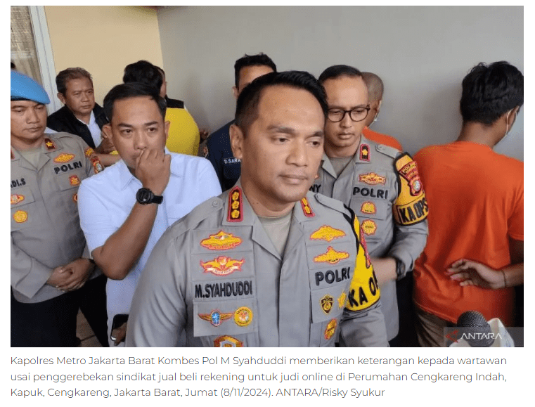 SENTANINEWS.ID- JAKARTA –Polisi mengungkap 4.324 rekening yang dibeli dari masyarakat oleh sindikat jual beli rekening di Cengkareng, Jakarta Barat dikirim ke bandar judi online (judol) di Kamboja memakai jalur ekspedisi resmi. “Jalur resmi,” kata Kapolres Metro Jakarta Barat Kombes Pol M Syahduddi dalam penggerebekan sindikat bersangkutan di Perumahan Cengkareng Indah, Kapuk, Cengkareng, Jakarta Barat, dikutip dari Antaranews.com, Jumat (8/11) Syahduddi menuturkan jalur ekspedisi resmi yang dimaksud … Lanjutkan membaca 4.324 rekening dikirim ke bandar judol Kamboja pakai ekspedisi resmi