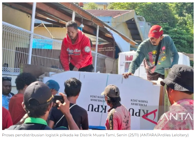 SENTANINEWS.ID – JAYAPURA – Komisi Pemilihan Umum (KPU) Kota Jayapura, Papua mendistribusikan sebanyak 66 kotak suara ke tempat pemungutan suara (TPS) yang berada di Distrik Muara Tami, Senin (25/11) Ketua KPU Kota Jayapura Martapina Anggai di Jayapura, Senin, mengatakan pendistribusian logistik pemilihan kepala daerah (pilkada) pada hari pertama berfokus pada daerah yang berada di perbatasan RI-PNG yakni Distrik Muara Tami. “Jadi kami mendistribusikan logistik pilkada … Lanjutkan membaca KPU Kota Jayapura distribusikan 66 kotak suara ke Distrik Muara Tami