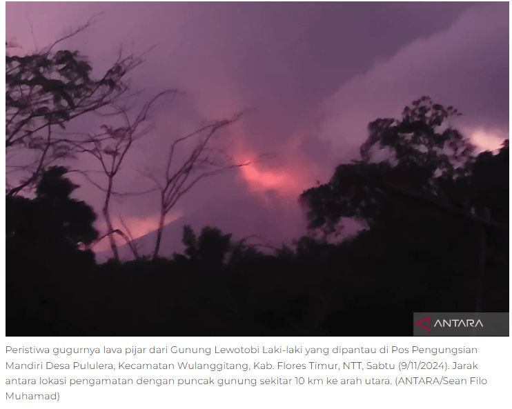 SENTANINEWS.ID – Flores Timur – Gunung Lewotobi Laki-laki yang terletak di Kabupaten Flores Timur, Nusa Tenggara Timur (NTT) memuntahkan guguran lava pijar dalam erupsi yang terjadi pada Sabtu pagi, sekitar pukul 04.40 WITA. Hal tersebut diperoleh berdasarkan pantauan ANTARA di Pos Pengungsian Mandiri Desa Pululera, Kecamatan Wulanggitang, Kab. Flores Timur, NTT, Sabtu, (9/11) dengan jarak antara lokasi pengamatan dengan puncak gunung sekitar 10 km ke … Lanjutkan membaca Gunung Lewotobi Laki-laki, Sabtu pagi, muntahkan guguran lava pijar