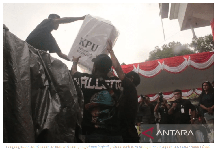 SENTANINEWS.ID – SENTANI – Komisi Pemilihan Umum (KPU) Kabupaten Jayapura, Papua, mendistribusikan logistik Pemilihan Kepala Daerah (Pilkada) 2024 ke daerah tertinggal, terdepan dan terluar (3T) melalui sungai.Distrik Airu Kabupaten Jayapura memiliki enam kampung, yaitu dua kampung di daratan dan empat kampung di aliran Sungai Memberamo.Dikutip dari Antaranews.com, Ketua KPU Kabupaten Jayapura Efra J. Tunya di Sentani, Selasa, memastikan semua logistik sudah berada di lokasi dengan … Lanjutkan membaca KPU Jayapura distribusi logistik pilkada daerah 3T melalui sungai