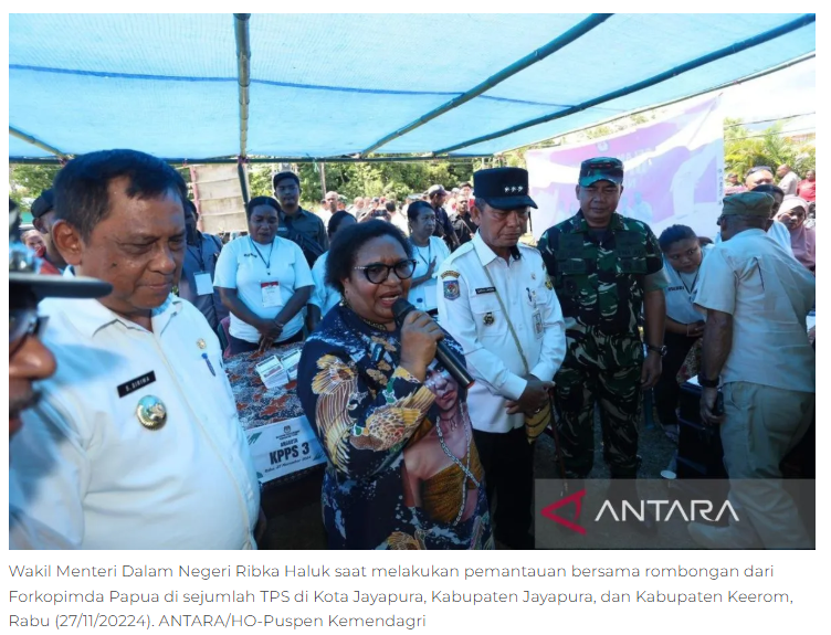 SENTANINEWS.ID – JAKARTA – Wakil Menteri Dalam Negeri (Wamendagri) Ribka Haluk menegaskan bahwa pelaksanaan Pilkada Serentak 2024 secara umum di Provinsi Papua berjalan dengan kondusif, aman, dan terkendali. Ribka Haluk mengemukakan hal itu usai melakukan pemantauan bersama rombongan dari Forum Koordinasi Pimpinan Daerah (Forkopimda) Papua di sejumlah tempat pemungutan suara (TPS) di Kota Jayapura, Kabupaten Jayapura, dan Kabupaten Keerom, Rabu (27/11). “Jadi, puji Tuhan, kami … Lanjutkan membaca Wamendagri: Pelaksanaan Pilkada 2024 di Provinsi Papua kondusif